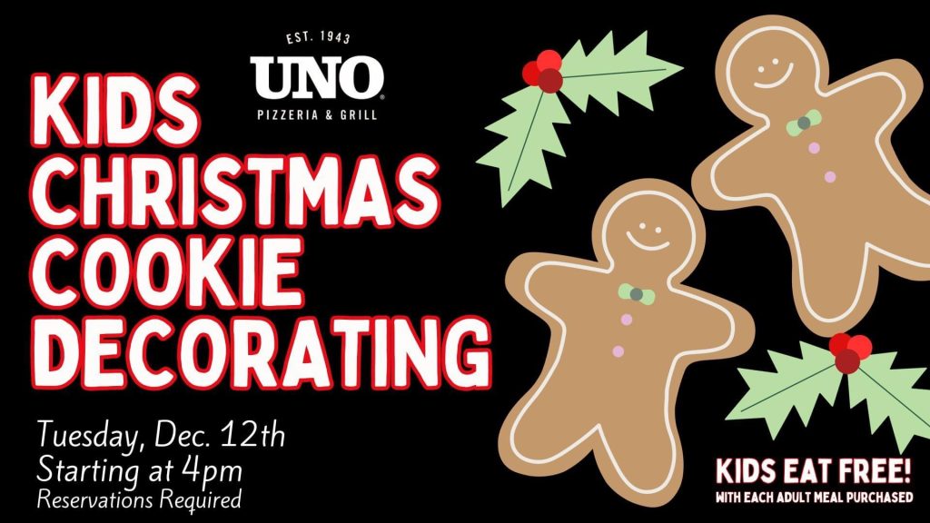 At Pizzeria Uno, there’s a kids’ cookie decorating event scheduled for Tuesday, December 12th, beginning at 4 PM. Reservations are necessary, and children dine at no cost with the purchase of an adult meal.