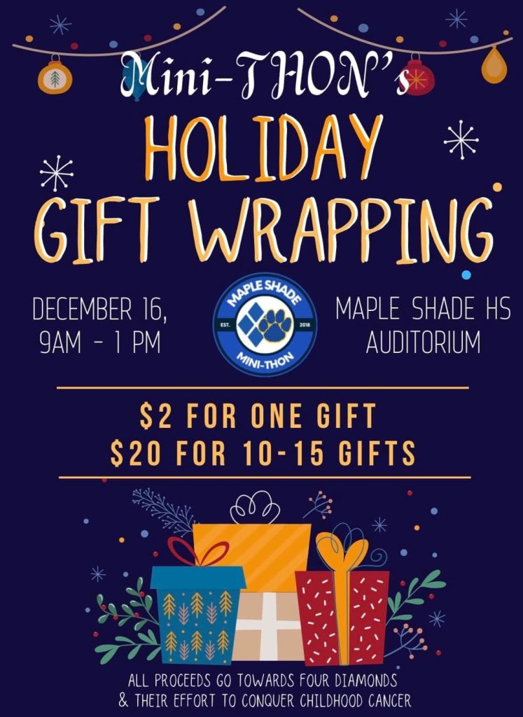 The MSHS Mini-Thon is hosting a Holiday Gift Wrapping event on December 16th, running from 9:00 AM to 1:00 PM at the MSHS Auditorium. All proceeds from this initiative support Four Diamonds in their mission to combat childhood cancer.