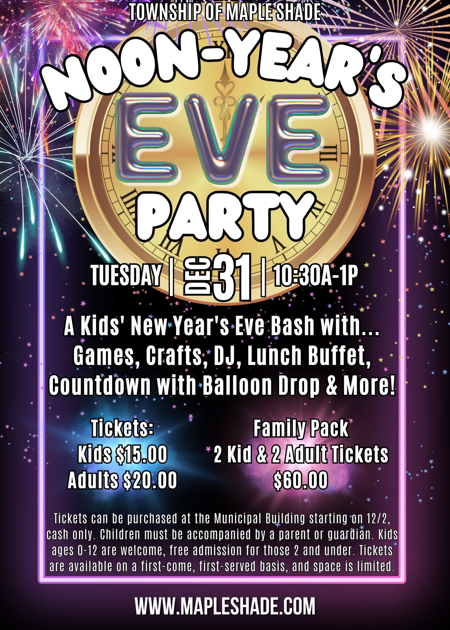 Township of Maple Shade 200 Stiles Ave, Maple ShadeCome celebrate the New Year with us and make it a day to remember! 🎉🎉 There will be a countdown to noon with a balloon drop, a kid-friendly lunch catered by Tony Roni’s Taphouse, plus crafts, games, and tons of fun! We can’t wait to ring in the New Year with you! 🎟️ Limited space ... [Read more...]